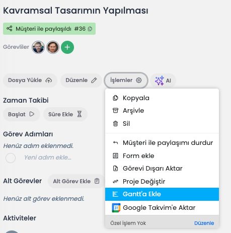 Görev Detaylarından Görevi Gantt’a Ekleme